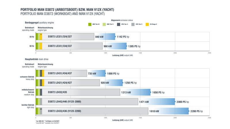 The 30-litre platform has already proven itself across a wide range of maritime and stationary applications. In the workboat segment, the D3872 engine family is established as a powerful and reliable main propulsion system. In the yacht market, it was recently introduced as the MAN V12X series, offering outputs of up to 1,618 kW (2,200 hp). The platform also forms the basis of the MAN E3872 gas engine used in stationary power generation. With the addition of the auxiliary variant, operators now benefit from a fully integrated engine family covering propulsion, on-board power and hybrid solutions within a single technological framework.